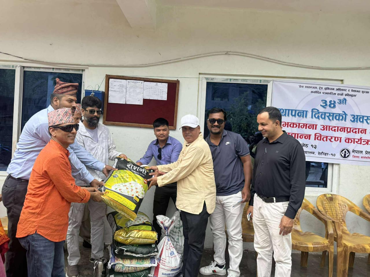 मंगलबार हेटौंडा-१० स्थित संस्कृत वेद विद्यालयलाई खाद्यान्न वितरण गर्दै नेपाल प्रेस युनियन मकवानपुरले ३४ औं स्थापना दिवस मनाएको छ ।