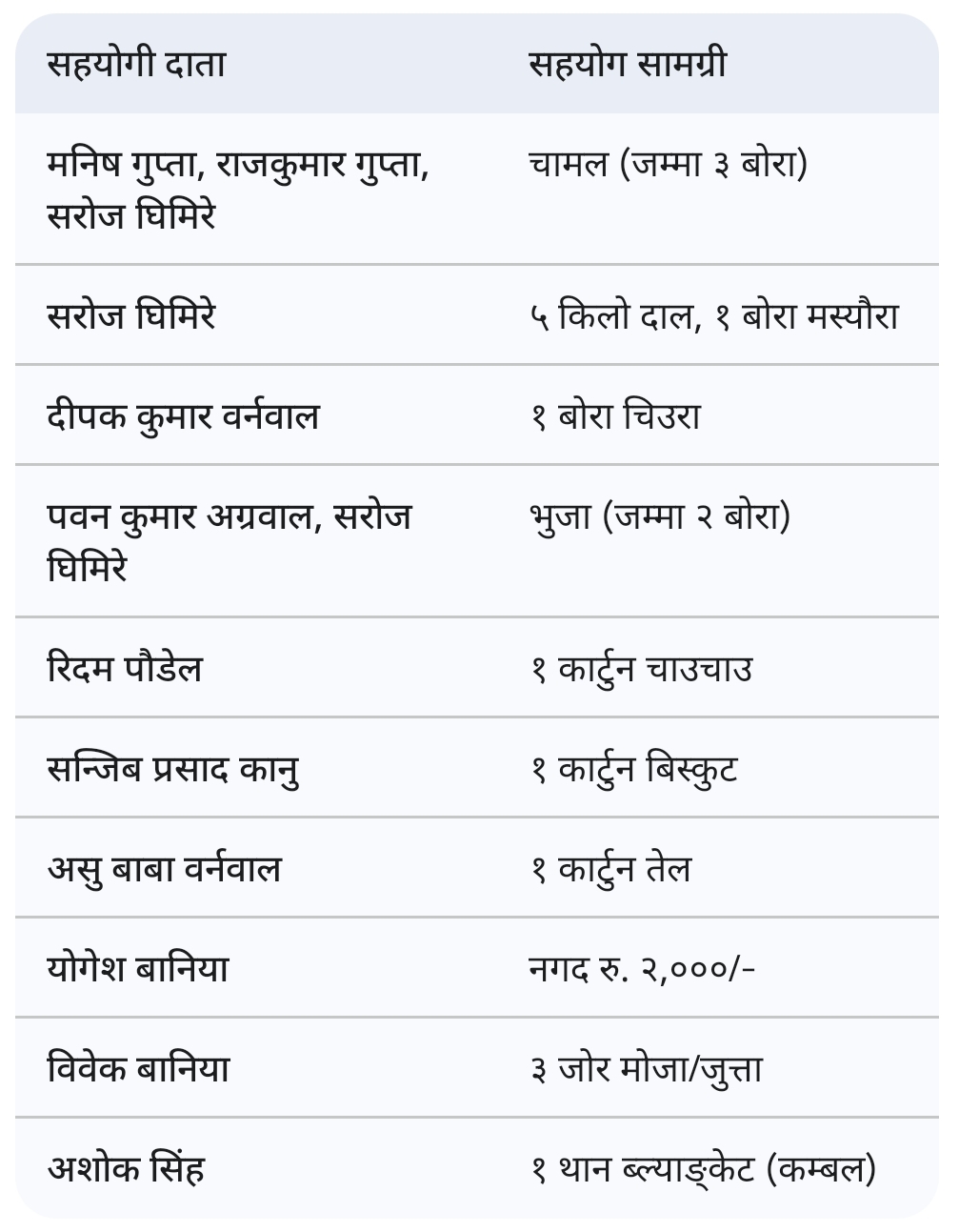 संस्थाका सदस्य तथा शुभेच्छुकहरुको सहयोगमा संकलन भएका राहत सामग्रीहरू विपन्न परिवारलाई हस्तान्तरण गरिएको सन् २०२५ का महासचिव संजय कुमार न्यौपानेले जानकारी गराए । सहयोगी दाताहरूले चामल, चाउचाउ, बिस्कुट, दाल, तेल, चिउरा, भुजा, मस्यौरा, नगद, मोजा/जुत्ता र ब्ल्याङ्केट (कम्बल) जस्ता अत्यावश्यक वस्तुहरु सहयोग गरेका थिए ।