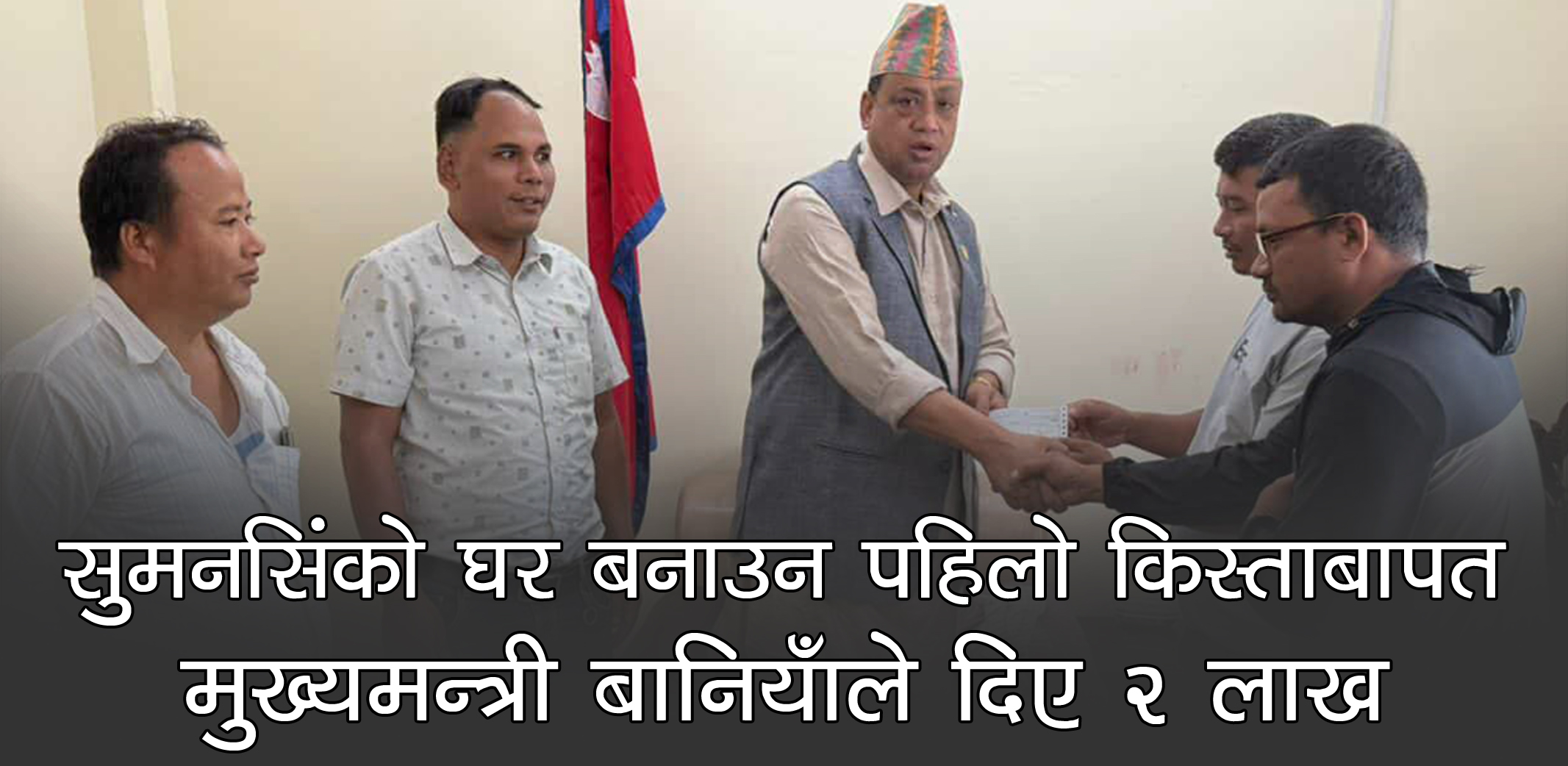 राक्सिराङ गाउँपालिका-१ इन्द्रुङका विपन्न सुमनसिं चेपाङको घर बनाइदिने घोषणा गरेका बागमती प्रदेशका मुख्यमन्त्री ईन्द्रबहादुर बानियाँले घर निर्माणका लागि पहिलो किस्ताबापत २ लाख रुपैयाँ हस्तान्तरण गरेका छन् ।